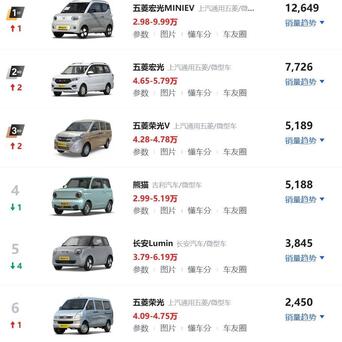 2月微型车排行榜出来了,五菱宏光MINIEV以大比分领先吉利熊猫、长