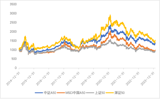 图表:主要宽基指数走势(2014-12-31至2024-02-21)