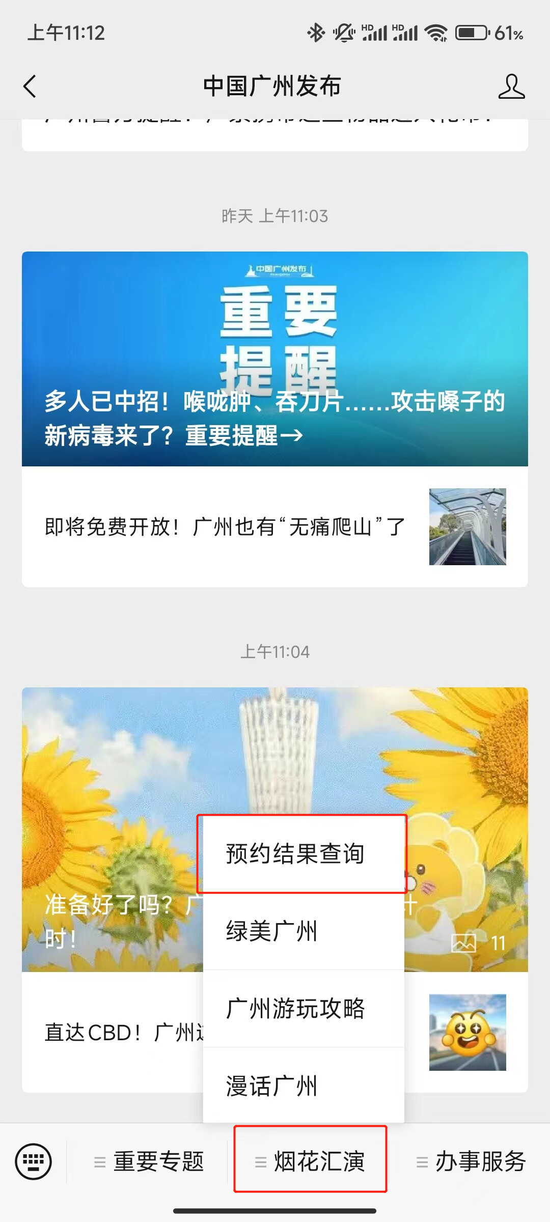 ①进入“中国广州发布”微信公众号,点击下方“烟花汇演-预约结果查询”