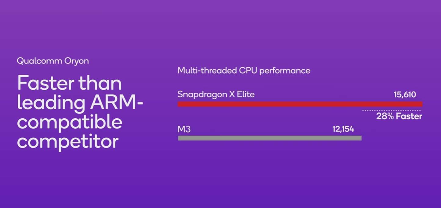 性能方面,“跑分数据”显示,高通的这两款Arm芯片都能做到多核性能超越苹果M3,同时在与AMD和英特尔的高端产品对比中,骁龙X芯片也展现出“同等功耗性能更强、同等性能功耗更少”的优势。