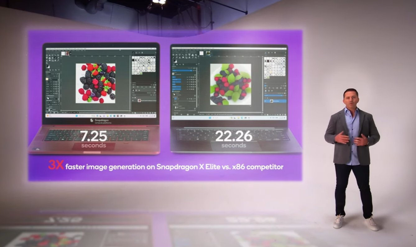 举例而言,在视频剪辑软件达芬奇中运行“神奇遮罩”功能时,骁龙X芯片能够比英特尔最新发布的酷睿Ultra 7快上3倍。同时在本地运行“文生图”运算时,骁龙X芯片也能比x86平台的竞品快上3倍。