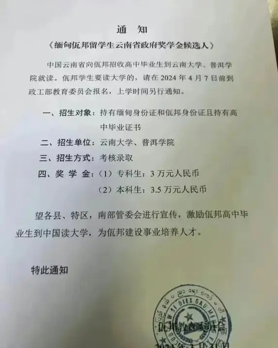 该通知文件的图片显示,“中国云南省向佤邦招收高中毕业生到云南大学、普洱学院就读。”招生对象的要求为:“持有缅甸身份证和佤邦身份证且持有高中毕业证书”。而奖学金方面,文件显示为“专科生3万元人民币,本科生3.5万元人民币。”